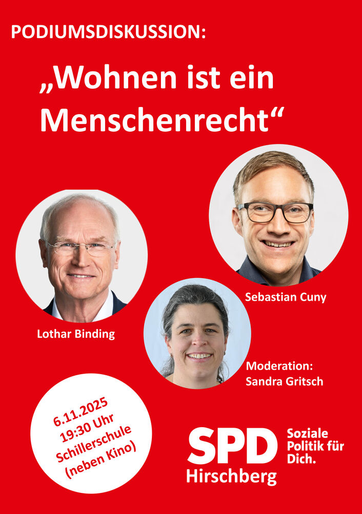 Lothar Binding, Sebastian Cuny und Sandra Gritsch laden einWohnen muss für alle Menschen bezahlbar, verfügbar und umweltverträglich sein. Wir als SPD meinen auch "Wohnen ist ein Menschenrecht". Zu diesem Thema veranstalten wir am 6.11.25 eine Podiumsdiskussion mit Sebastian Cuny MdL, Lothar Binding ExMdB und Mieterverein HD, Sandra Gritsch Ortsvereinsvorsitzende und betroffenen Personen. Sie findet in der Schillerschule (Neben Kino Leutershausen) statt. Es ergeht "Herzliche Einladung" an alle interessierte Bürgerinnen und Bürger. Lesen Sie auch unsere Pressemitteilung auf der nächsten Seite.