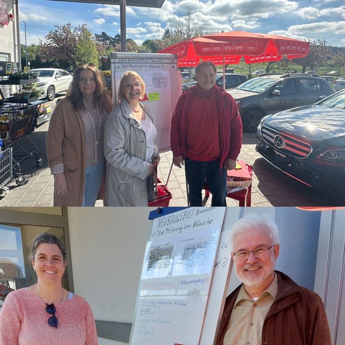 Traditionell verteilen wir am Ostersamstag Ostereier an die Menschen vor den Edekas in beiden Ortsteilen. Dazu wird immer eine Frage gestellt. Dieses Jahr fiel die Auswahl nicht schwer und traf zugleich voll ins Schwarze: Was denken die Hirschbergerinnen und Hirschberger über ein Neubaugebiet? Wir hatten Anschauungsmaterial dabei – die MORO-Pläne – und konnten so auch Menschen informieren, die von den Überlegungen noch gar nichts gehört hatten.