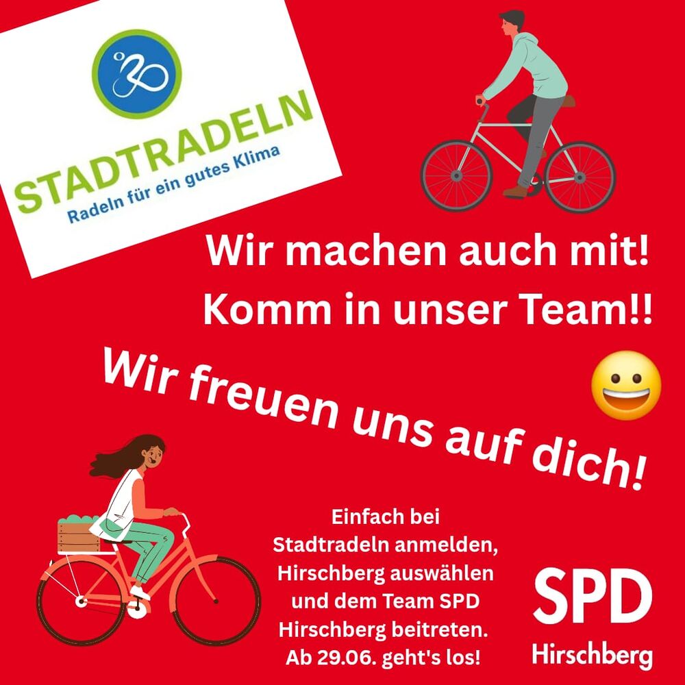 Bist auch du ein passionierter Radler oder eine Radlerin? Wir lieben Radfahren! Deshalb sind auch wir von der SPD Hirschberg bei Stadtradeln dabei. Mach mit! Lass das Auto stehen und schwing dich auf den Sattel. Keine Lust auf Stau, rote Ampeln und Abgase? Wir auch nicht. Deshalb machen wir auch dieses Jahr wieder mit und freuen uns, wenn auch du mitradelst. Wir freuen uns auf dich!