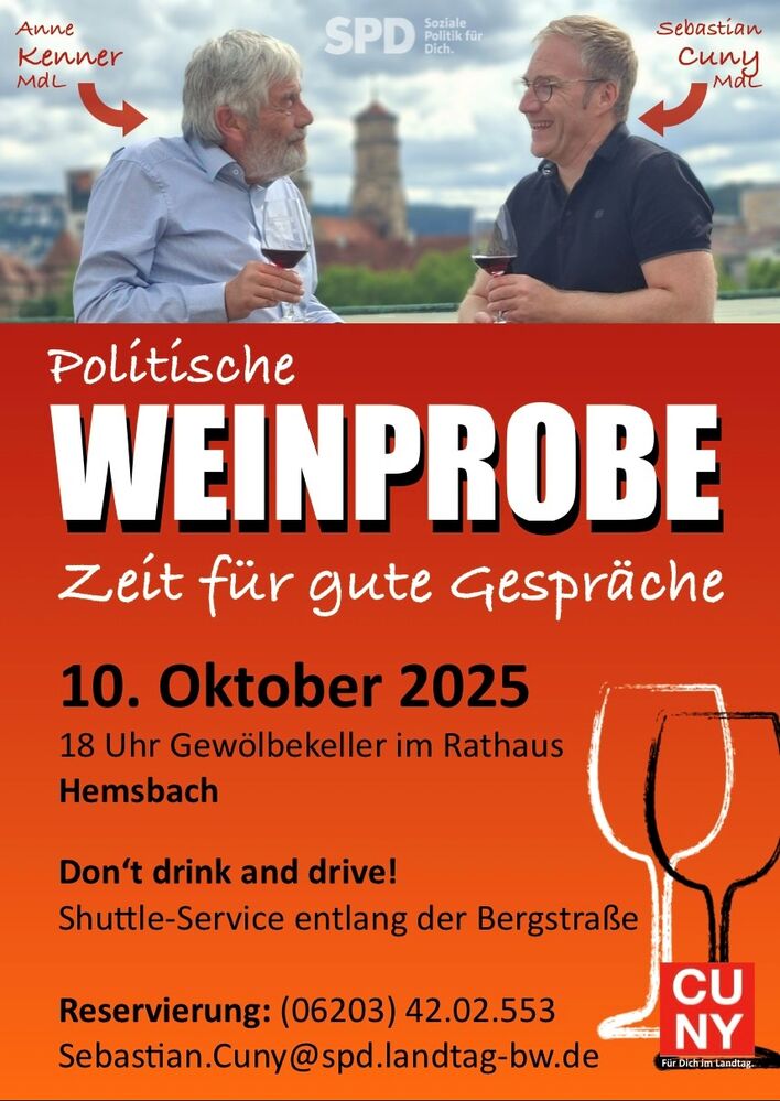 Da die Resonanz auf die Weinproben in den letzten Jahren sehr groß war, bittet Cuny um rechtzeitige Anmeldung zur Weinprobe und zum Shuttle-Service bis zum 30.9. bei seinem Team unter 06203 - 4202553 oder unter sebastian.cuny@spd.landtag-bw.de.